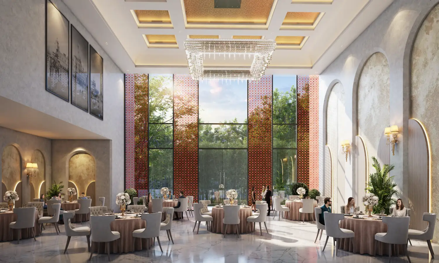 An impressive 80-foot wide entrance with a signature fountain, creating a grand and elegant arrival experience from the very first moment.